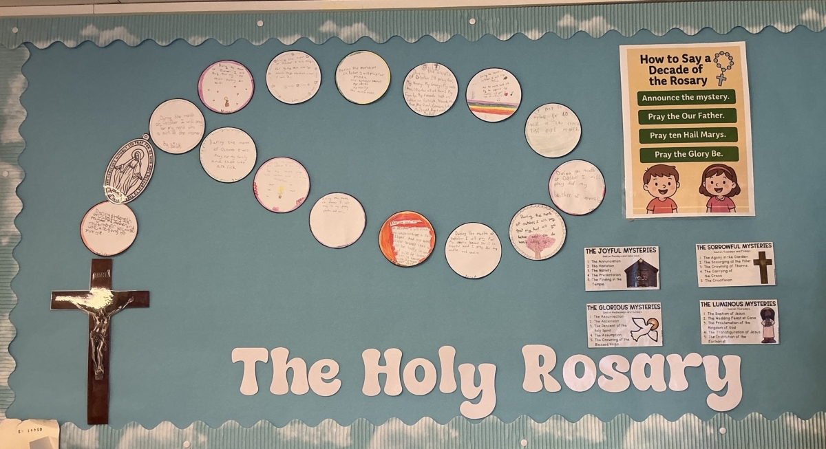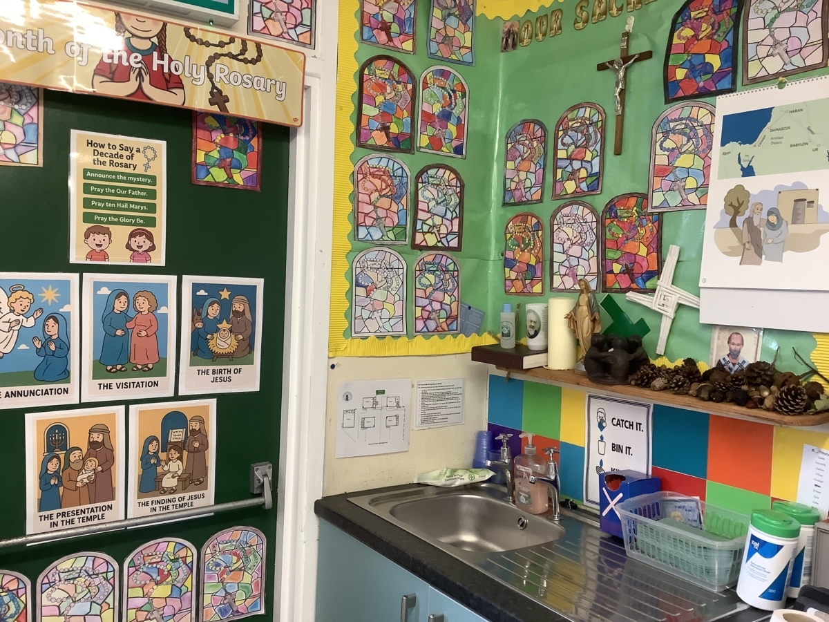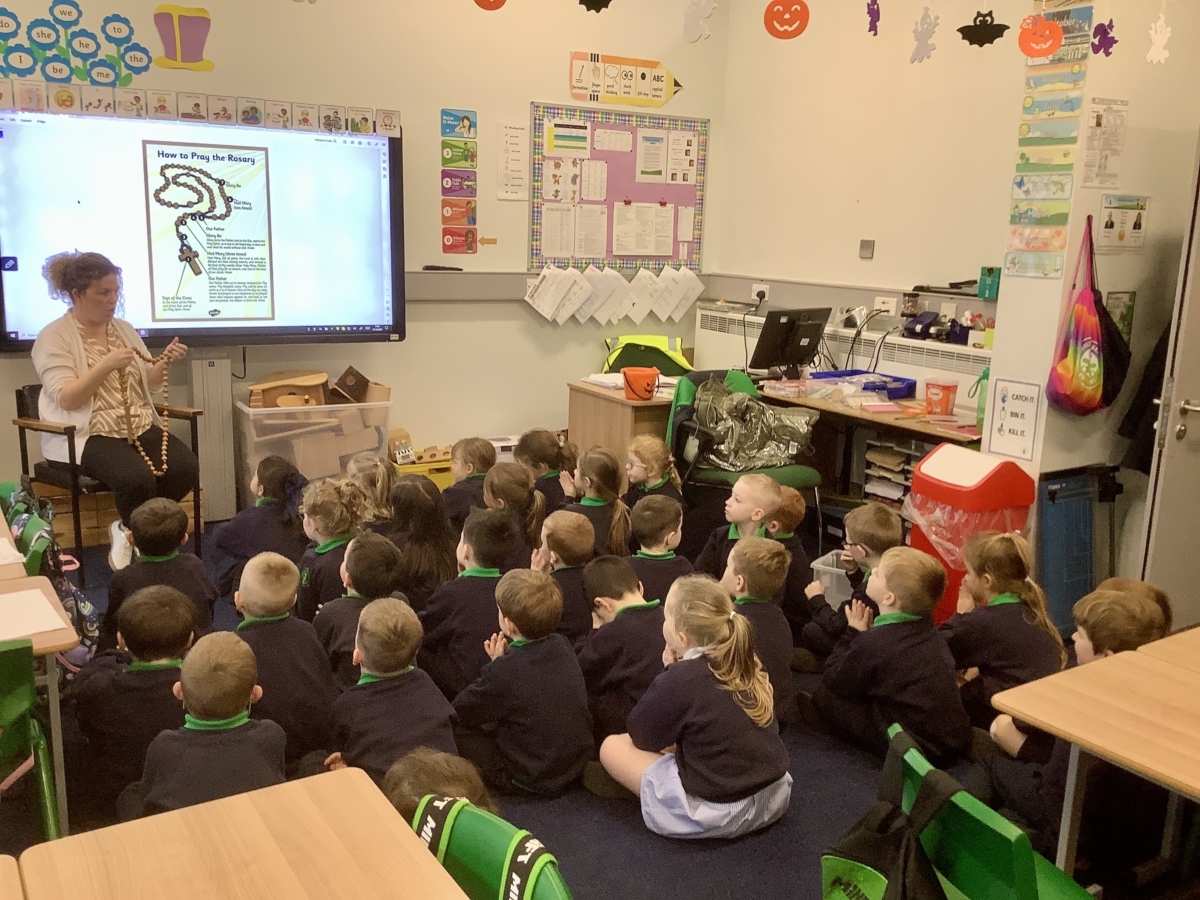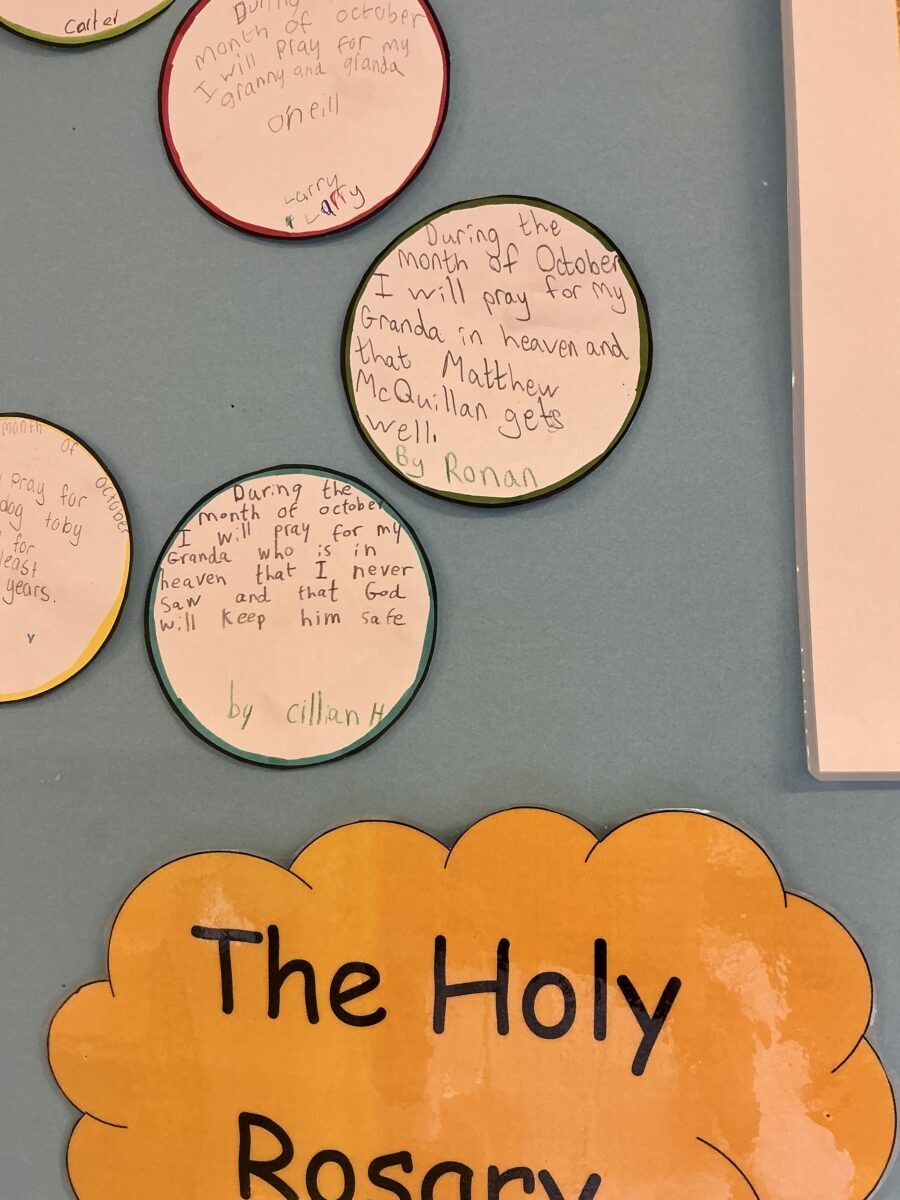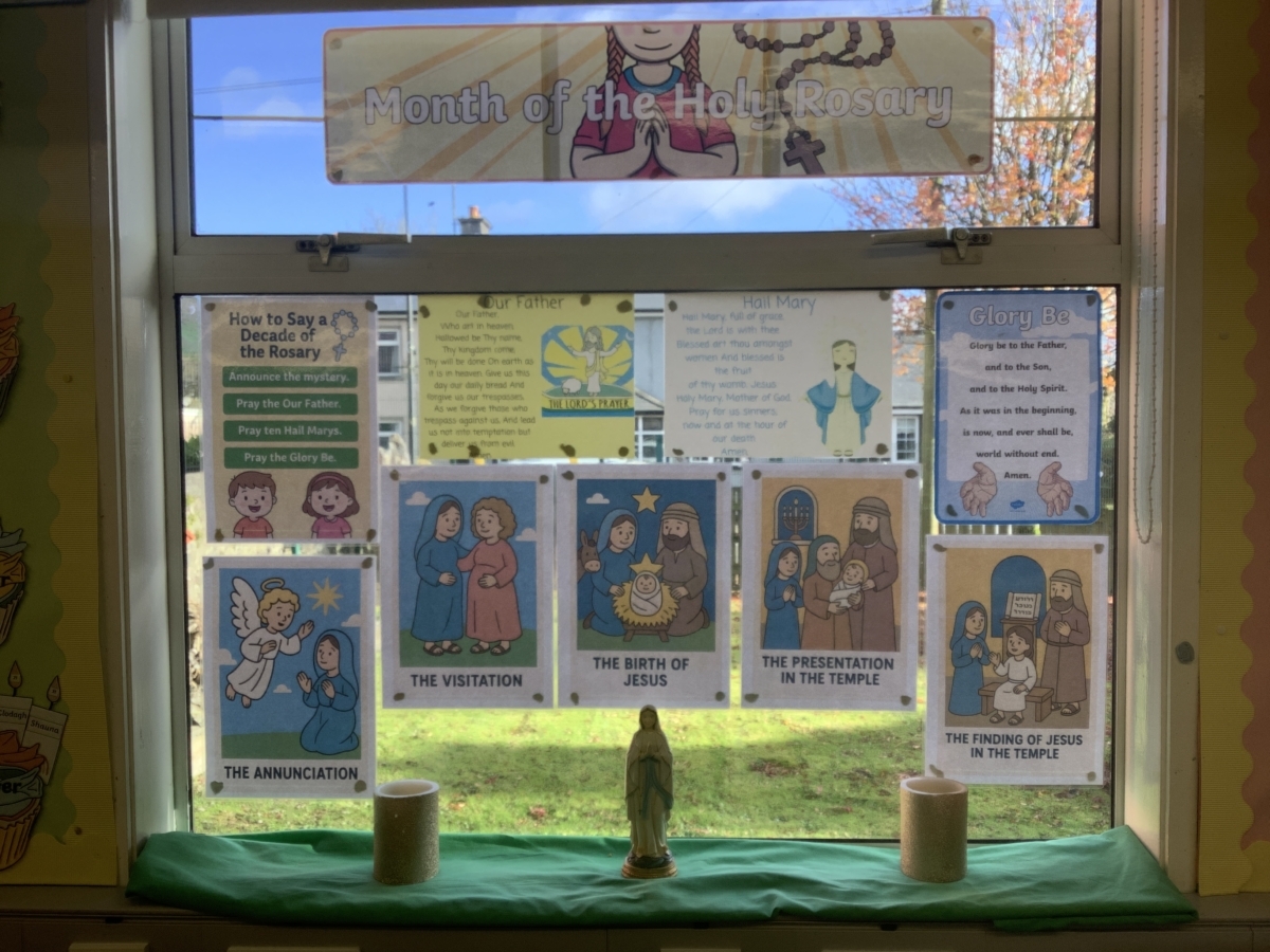 Throughout the month, each class has been learning about the Joyful Mysteries of the Rosary, exploring their meaning and significance through storytelling, art and prayer. Pupils have had the opportunity to create their own Rosary beads; listen to biblical stories about the life of Jesus and Mary; and join in collective prayer sessions in our Parish Hall and classrooms.