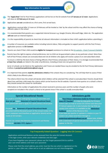 | Tuesday 27 January 2026 - at 12 noon | EA Connect opens for online applications for Post Primary. |